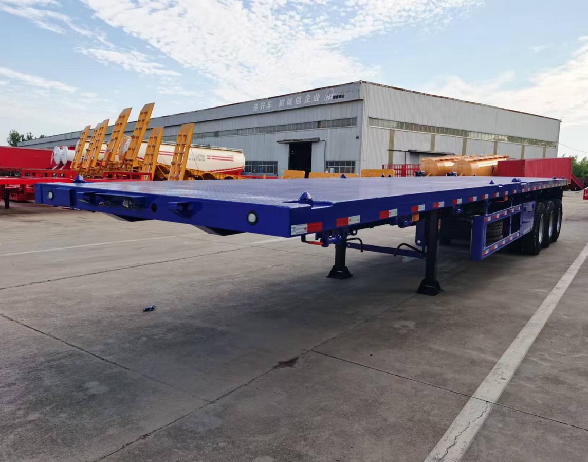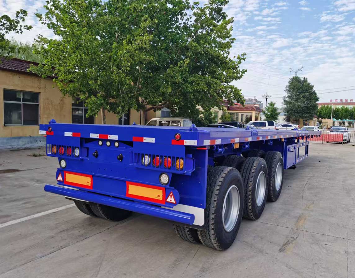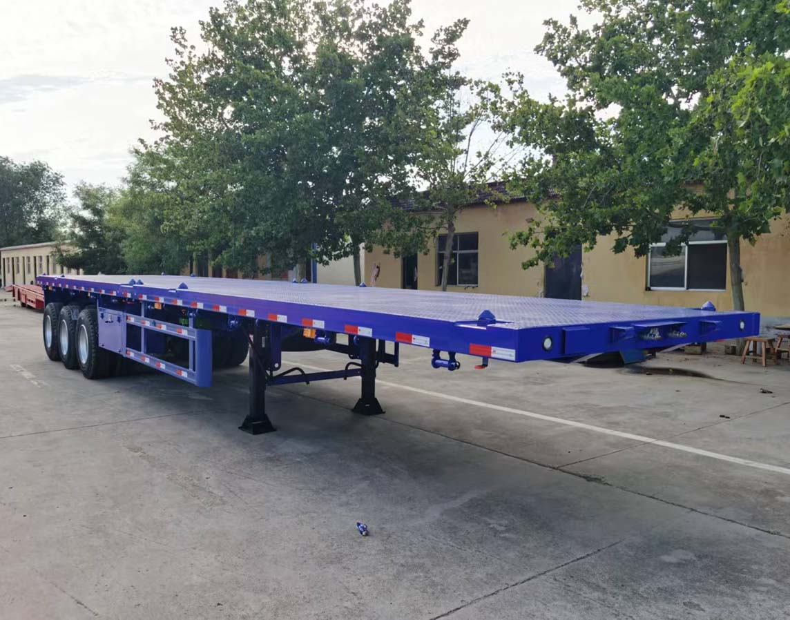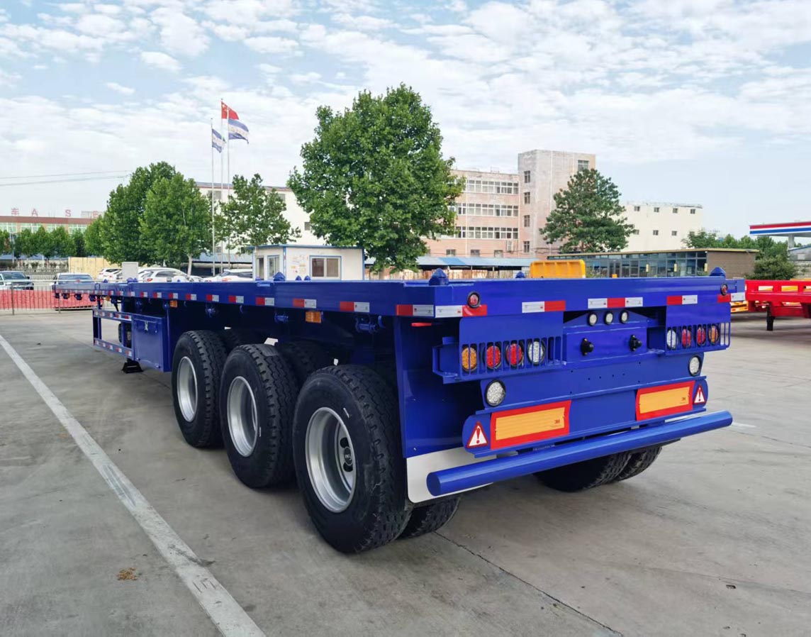 Container trailer specification:Size 12.4*2.48*1.52m, main beam up 14 and down 16, 8mm thickness vertical plate, bottom plate 3mm thickness with pattern. Guangdong Fuhua axle 13 tons x 3 bar, American mechanical suspension 8mm thickness, leaf springs 10 pieces x 13mm thickness x 90mm width, tires 12R22.5 x 13 pcs.